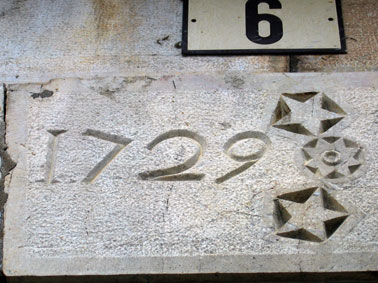 Étoile disposées en forme de roues dentées d'engrenage. A mettre peut être en rapport avec le moulin à huile qui se trouvait juste en face.
