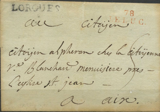 Lettre entre 1792 et 1796, avec marque linéaire 78 LE LUC rouge et tampon LORGUES noir.