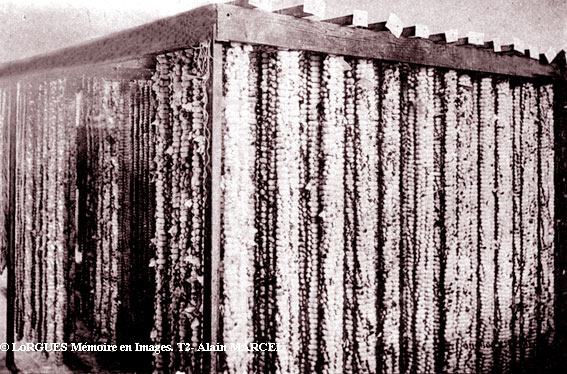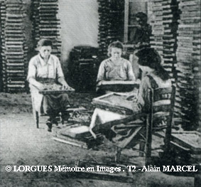 Lorgues était un lieu important du grainage : ses conditions climatiques, la qualité de sa feuille de mûrier, le bon soin des éleveurs étaient des atouts appréciés. Le nombre important de petites éducations familiales dispersées était aussi un avantage pour cette activité. Car, pour faire ses divers croisements et sélections, pour suivre ses différentes races, le sériciculteur–graineur ne pouvaient élever lui-même tous les vers nécessaires à la production des cocons dont il avait besoin. Il avait recours aux petites magnaneries particulières. Celles-ci étaient en général une pièce du domicile consacrée pendant quelques mois à cette activité assurée par la femme au foyer qui bénéficiait ainsi d’une source de revenu appréciable. On comptait plusieurs centaines de petites unités de ce type à Lorgues au début du XX e siècle. Le graineur leur fournissait gratuitement les oeufs et elles s’engageaient à les élever avec les soins voulus. Une quarantaine de jours plus tard les cocons obtenus étaient livrés. Ils étaient triés en fonction de différents critères de qualité et de sexe et préparés pour la reproduction. Les cocons femelles étant plus lourds, on les reconnaissait en les pesant, . On plaçait les cocons de façon à ce que la sortie des papillons se fasse dans de bonnes conditions et que leur ramassage soit facile. Pour cela, ils étaient disposés en filanes. Les ouvrières les enfilaient en chapelets en les piquant au milieu de leur longueur et en prenant soin de ne pas faire pénétrer l’aiguille profondément afin de ne pas blesser la chrysalide. Les cocons étaient accouplés deux à deux dans une position parallèle. Toutes les filanes étaient suspendues dans la salle de grainage, bien aérée et à l’abri du soleil. |
