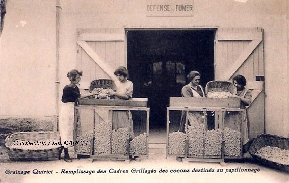 | L’atelier Firmin Arnaud qui était situé au quartier de Réal Cornu. L'élaboration des filanes, ou fielagnes, exigeait une main d'oeuvre importante aussi les graineurs imaginèrent d'autres systèmes pour le papillonage, comme les cadres en bois grillagés que l'on voit ci-dessus. Les cocons y étaient disposés en vrac et à leur sortie les papillons passaient au travers des trous du grillage et restaient accrochés à l'extérieur où ils étaient ramassés. |
