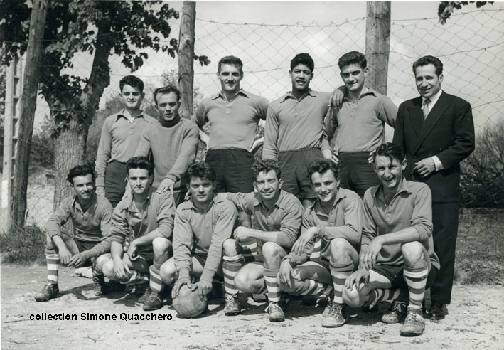 "L'équipe de foot, je reconnais au 1er rang : René Bagarre, Roland Borsi, mon frère Gilbert (Flandin), Nervi , au 2 ème rang : Giacomini, Robert Ardala …"