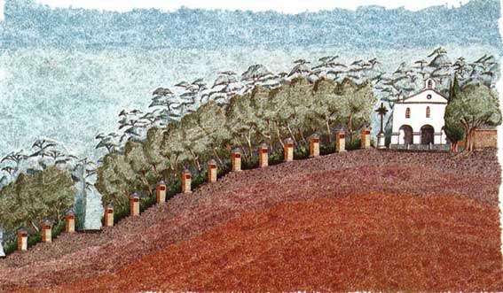 Illustration de S.Ducornet & M-T Narino pour carte de voeux 2000 de la mairie Année de la restauration du chemin de croix et des murs de St-ferréol