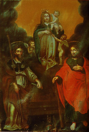 Grand tableau du peintre L'Ecuyer,Vierge à l'enfant entourée des deux St Jacques : St Jacques de Compostelle et St Jacques le Mineur .