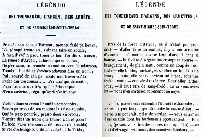 Cataractes et Tombereaux d'Argens, chapelle de Saint Michel Sous Terre Publié en 1861 Margarido du poéte lorguais Marius Trussy contient la Légende des Tombereaux d'Argens, des Armettes et de Saint-Michel-Sous-Terre On trouve aussi en fin de volume une série de notes sur la Provence . Extraits: |