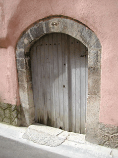 Porte de maison avec navette sculptée. (atelier d'un ancien tisserand)