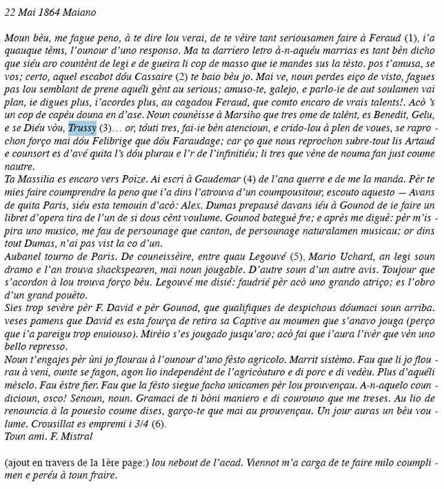 | Mistral estimait Trussy qu'il cite à de très nombreuses reprises dans "Le Trèsor du Félibrige" son grand dictionnaire de la langue occitanne. Voici 2 extraits de sa correspondance avec Jean-Baptiste GAUT, félibre qui fut conservateur de la bibliothèque Méjane d'Aix. |