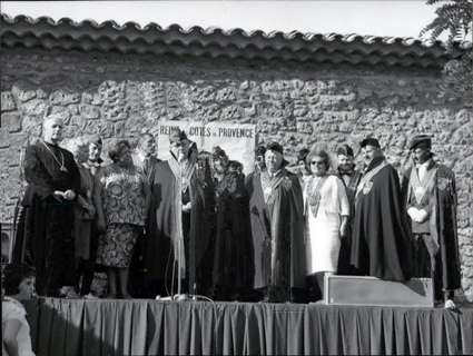 | Intronisation de Chevaliers de la Méduse à Berne en 1963. Cette confrérie bachique fut fondée en1690 et dissoute à la Révolution. En 1951, l’Ordre Illustre des Chevaliers de la Méduse fut réactivé par quelques propriétaires de la région. Animé par Henri de Laval, du château Sainte Roseline. Son objectif était de valoriser les traditions et les vins de Provence. | |