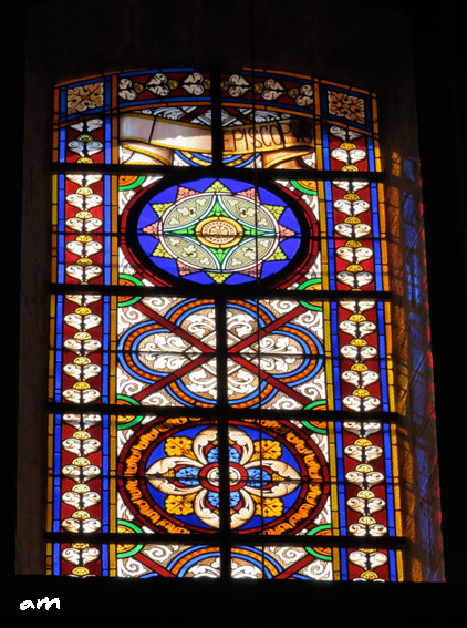 Le panneau supérieur gauche avec le début de l'inscription était manquant. La suite porte le mot “Episcopus”, soit évèque en latin. Le médaillon central du vitrail ne représentant pas un personnage mais un motif géométrique, il était impossible de savoir de quel évêque il s’agissait. Le choix a donc été de laisser la première partie du parchemin sans nom.