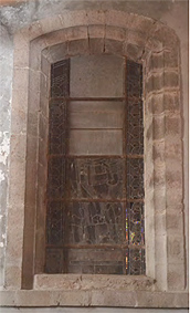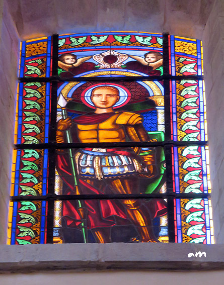 Vitrail représentant Saint Ferréol, saint patron de la ville (Inscription “Sanctus Ferreolus” dans le bas). Il était précédemment obturé. Les panneaux représentant le haut du personnage, torse et tête, étaient manquants et ne furent pas retrouvés. Il fallut donc reconstituer le dessin. Le choix a été fait de s’éloigner un peu de l’iconographie traditionnelle, celle du soldat romain casqué tenant la palme des martyrs. L’option choisie, d’un homme tête nue, porteur d’une lance, peut prêter à discussion. |