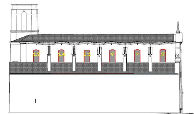 Côté Est Voir : vitrail n°5, vitrail n°7, vitrail n°9, vitrail n°11, vitrail n°13 , vitrail n°15